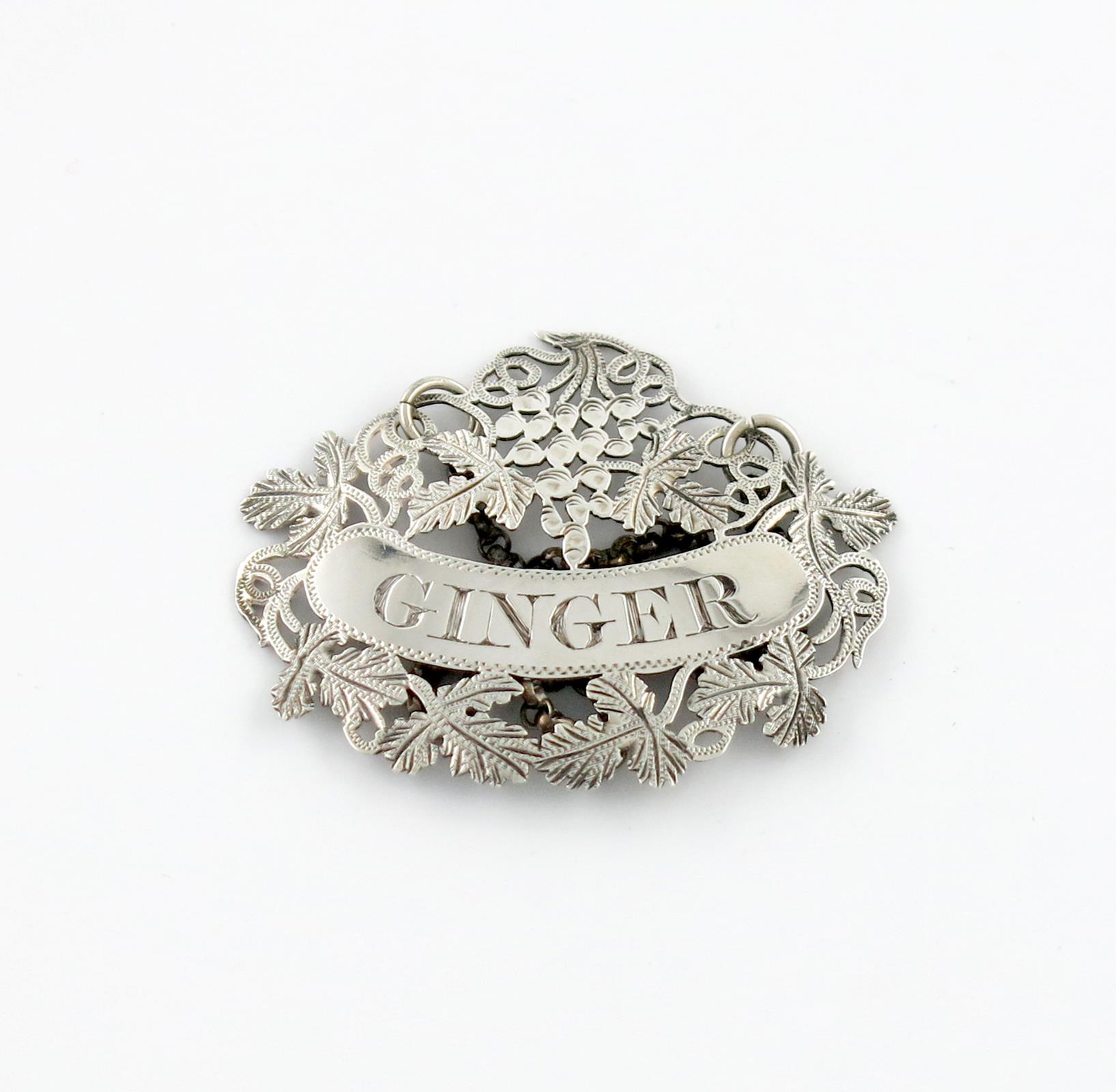 pierced shaped oval form, with trailing grapevine decoration, incised 'GINGER', length 5.3cm, approx. weight 0.3oz.