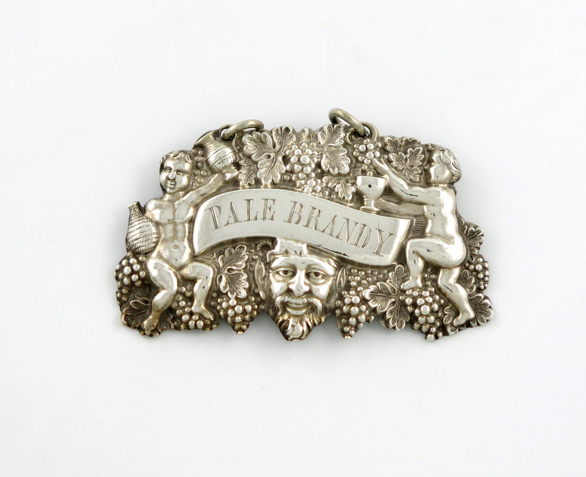 with Bacchanalian Putti with trailing vines, and a goblet, ewer and bottle, incised 'PALE BRANDY', length 5.4cm, approx. weight 0.3oz.