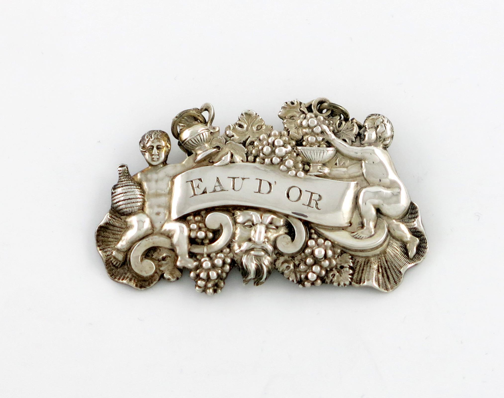shaped oval form, embossed with Bacchanalian putti and grapevines, incised 'EAU D' OR', length 6cm, approx. weight 0.4oz.
