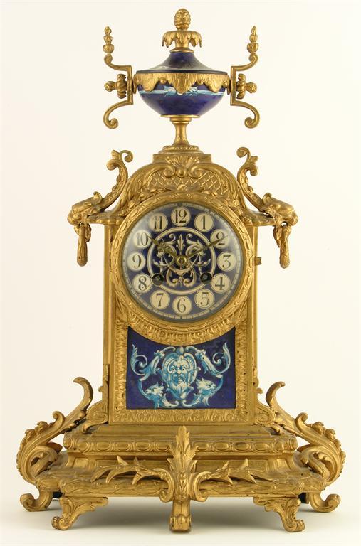 A 19th century French porcelain mount gilt brass mantel clock