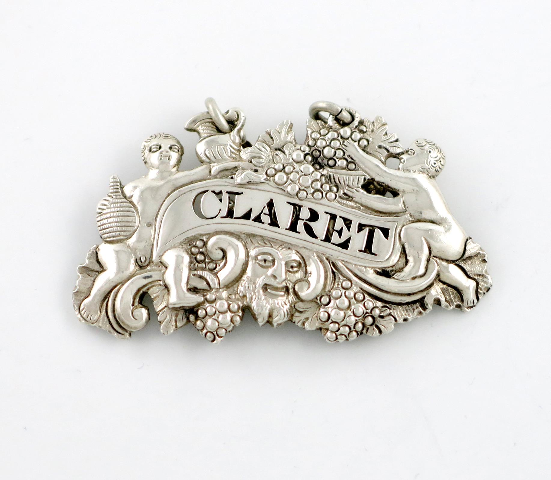 shaped oval form, with Bacchanalian putti and grapevines, pierced 'CLARET', length 6cm, approx. weight 0.9oz.