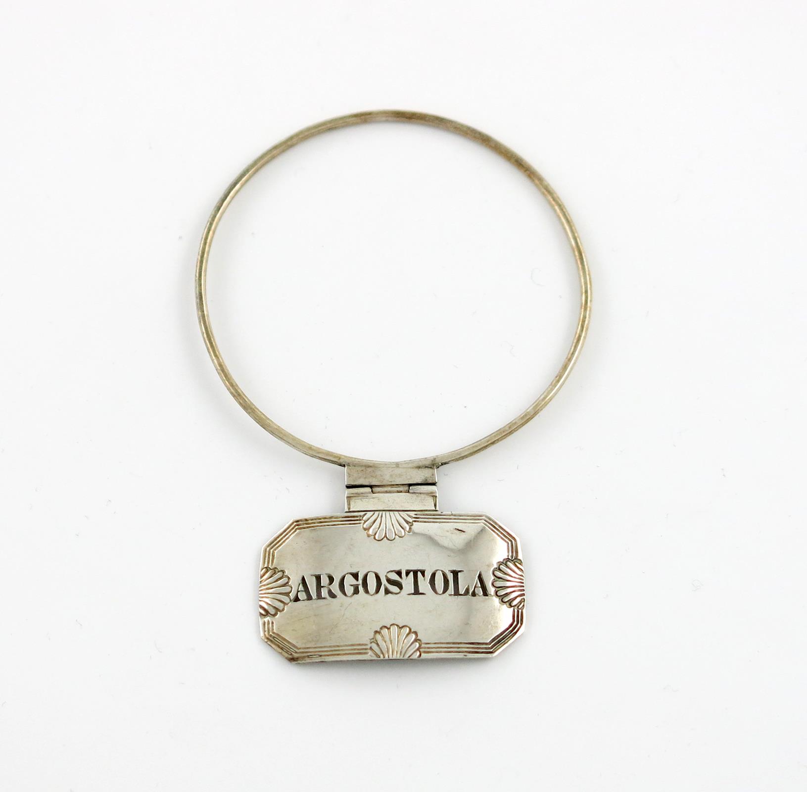 rectangular form, with reeded borders and shell motifs, pierced 'ARGOSTOLA', length 3.9cm, approx. weight 0.4oz.