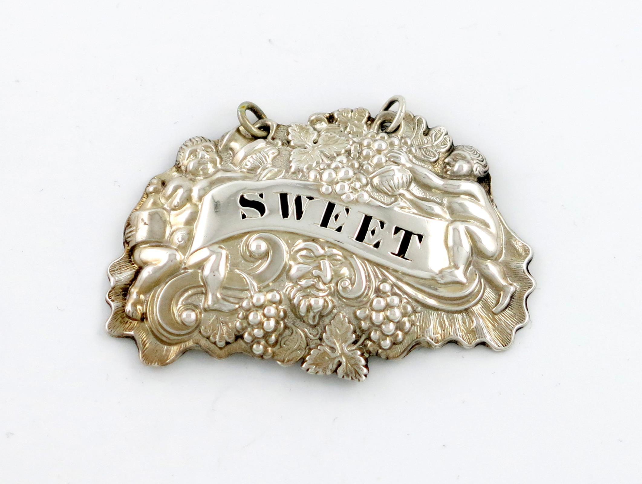 shaped oval form, embossed with Bacchanalian putti and grapevines, pierced 'SWEET', length 6cm, approx. weight 0.3oz.