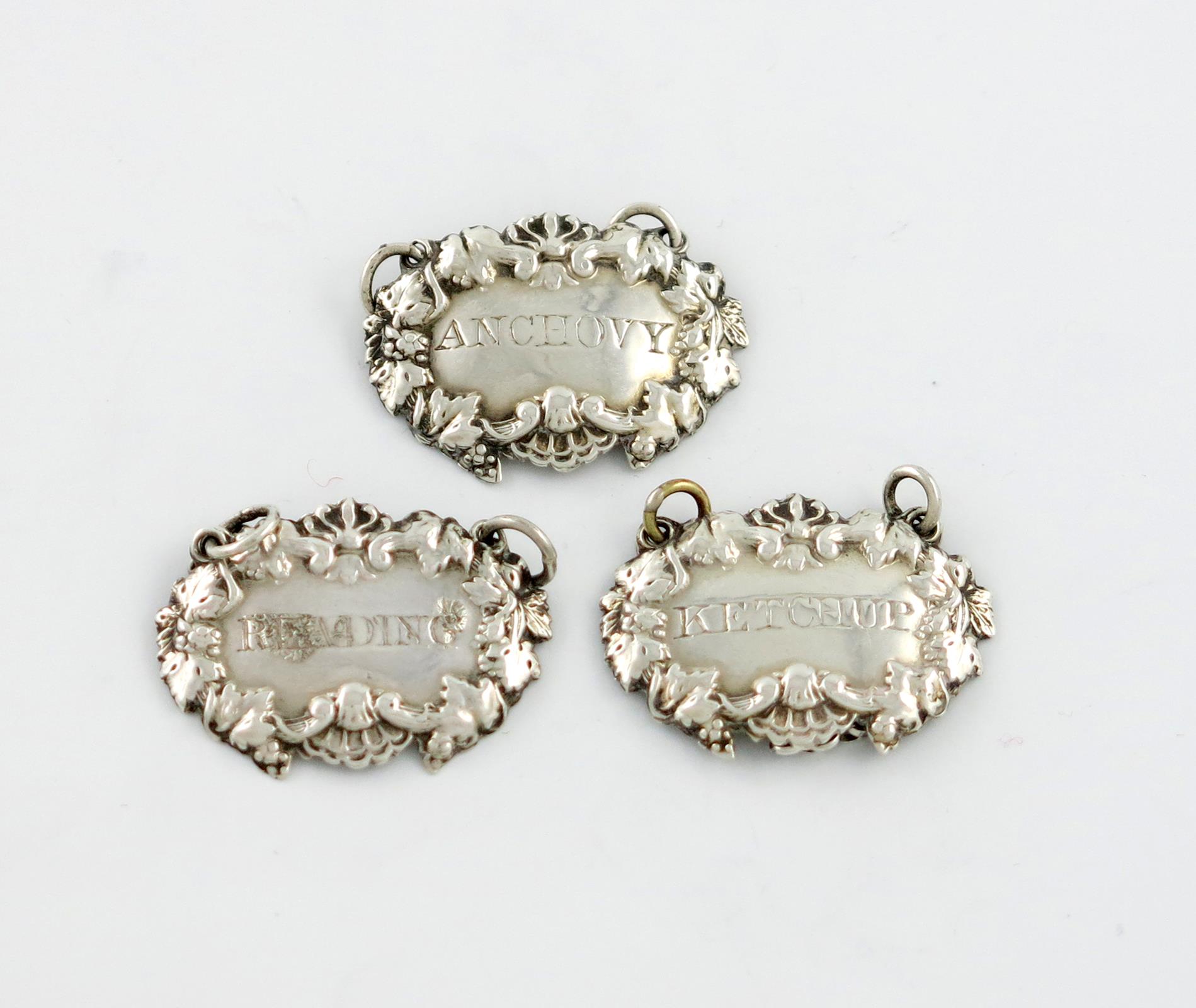 shaped oval form, foliate borders, incised 'KETCHUP', 'ANCHOVY' and 'READING,' approx. weight 0.3oz. (3)