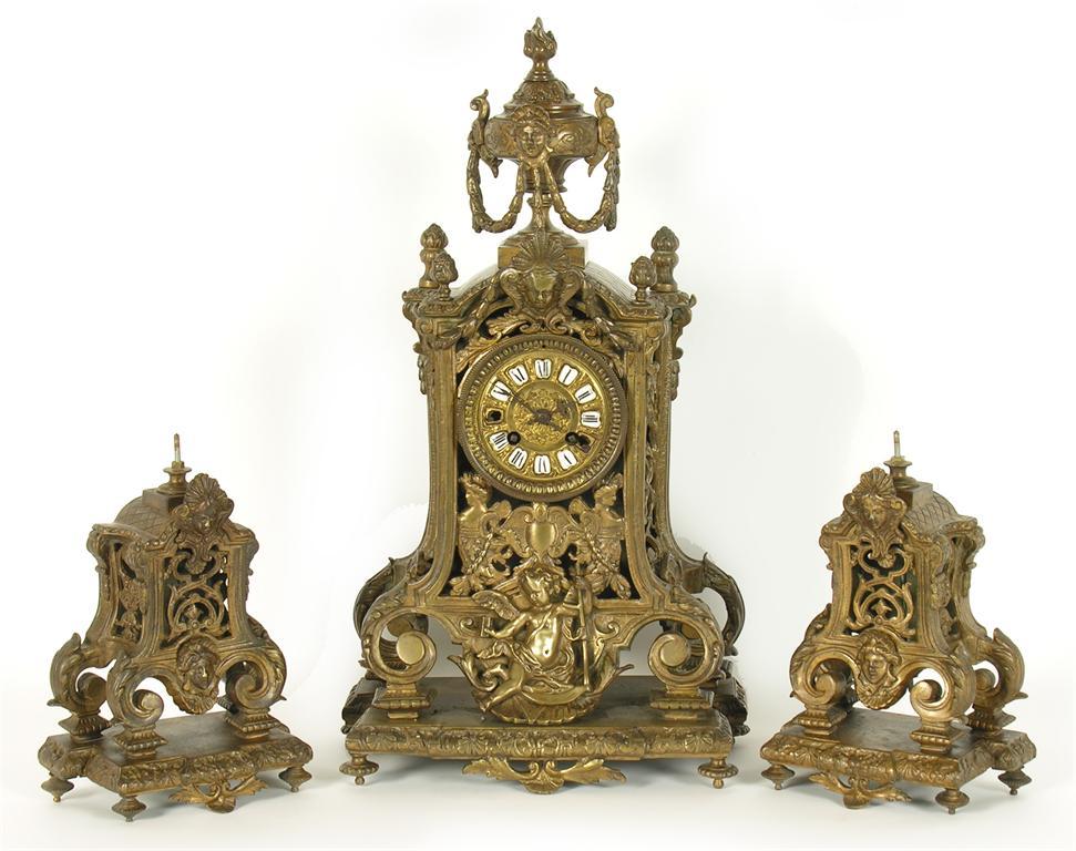 A 19th century gilt brass clock garniture, the 8 day movement stamped 'H & F PARIS,' with a outside countwheel and striking a bell to a circular dial with inset enamel numerals (two missing), 19in (48.2cm) h, the pair of flanking stands, missing their tops. (3)