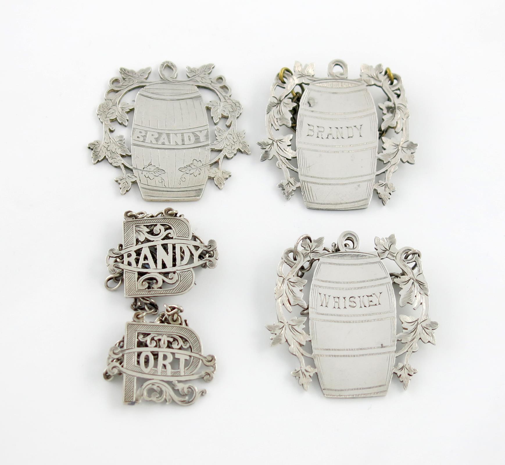 three modelled as barrels, incised 'BRANDY' (x2) and 'WHISKEY', plus two cut-out letter labels, for 'BRANDY' and 'PORT'. (5)