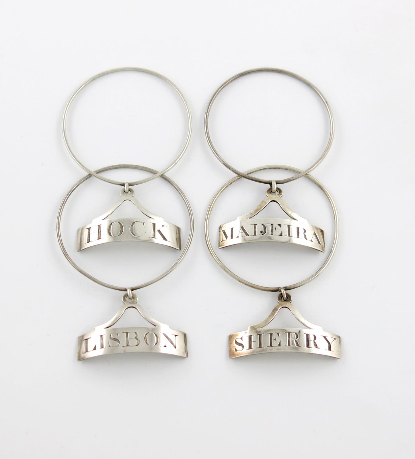 A set of four George III silver neck ring wine labels,