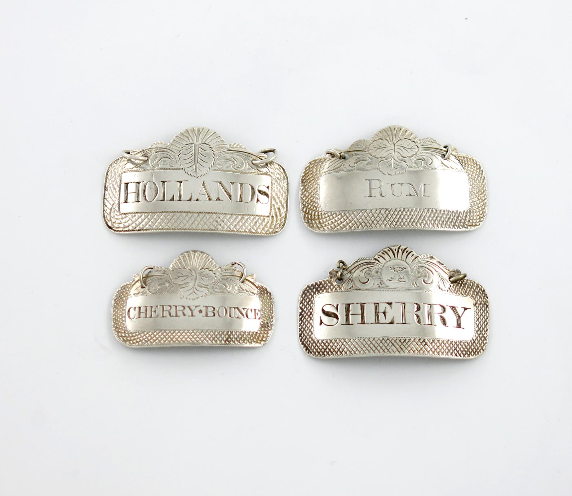 arched rectangular form, stylised and leaf border, incised 'CHERRY. BOUNCE', London 1816, plus 'RUM', 'HOLLANDS' and 'SHERRY', approx. weight 0.9oz. (4)