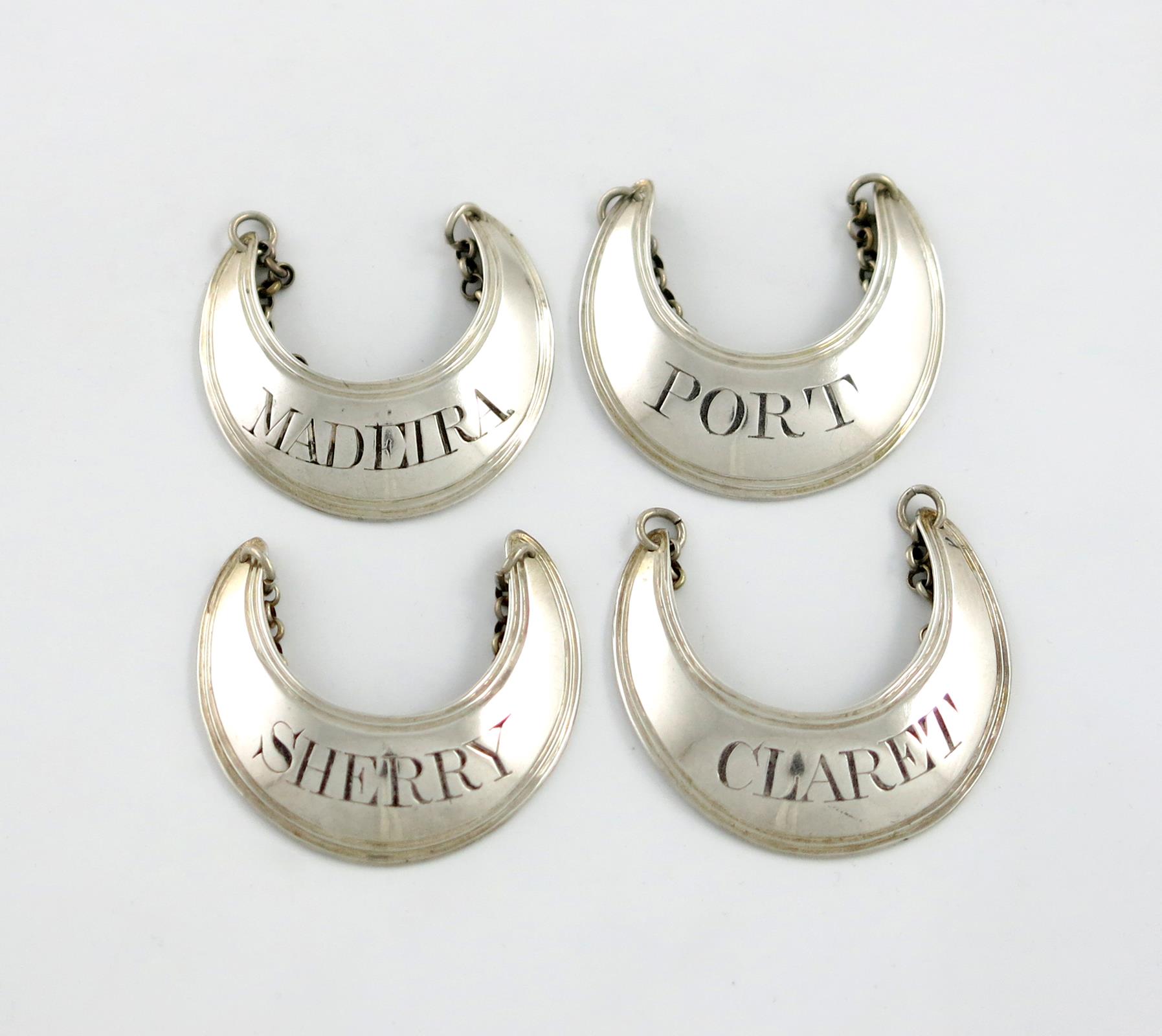 crescent form, thread border, incised 'MADEIRA', 'CLARET', 'PORT' and 'SHERRY', length 4.2cm, approx. weight 1oz. (4)