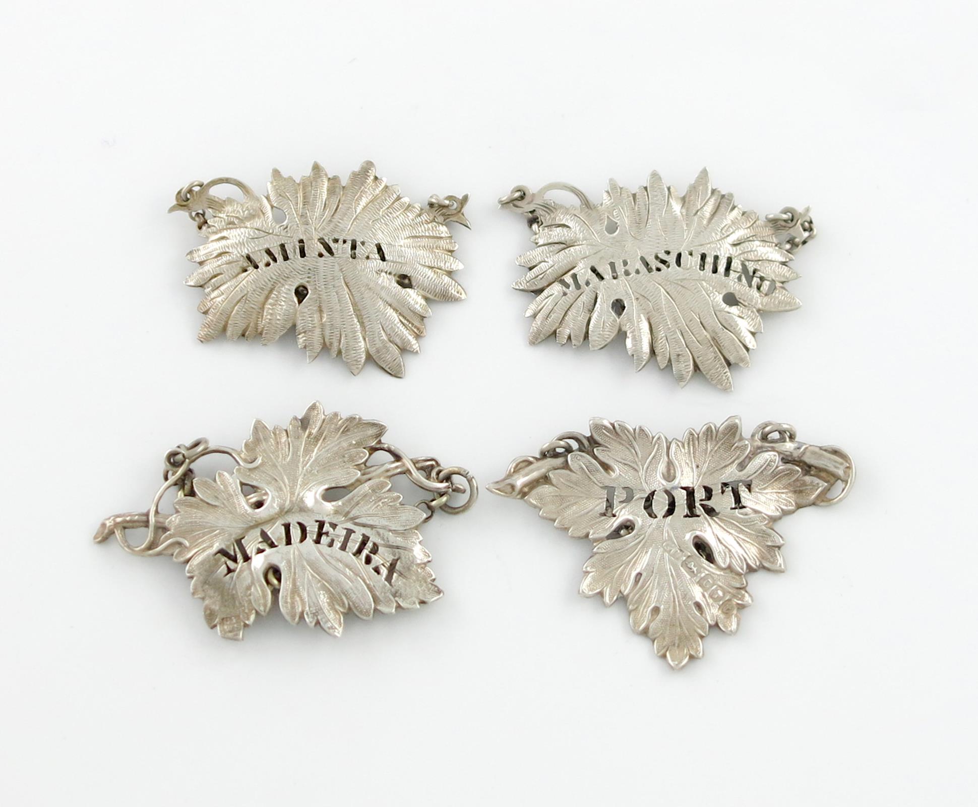 comprising: one by George Unite, pierced 'PORT', one pierced 'MADEIRA', plus a metal ware pair, pierced 'MARASCHINO' and 'AMINTA', approx. weight 1.1oz. (4)