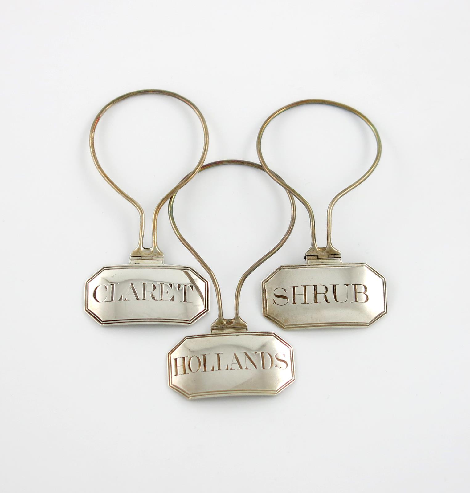 rectangular form, canted corners, reeded borders, hinged neck rings, incised 'CLARET', 'SHRUB' and 'HOLLANDS', length 4.8cm, approx. weight 1.4oz. (3)
