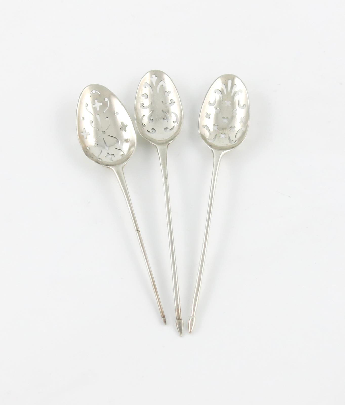 one with a double heel, and two others, the bowls with pierced decoration, approx. weight 0.6oz. (3)