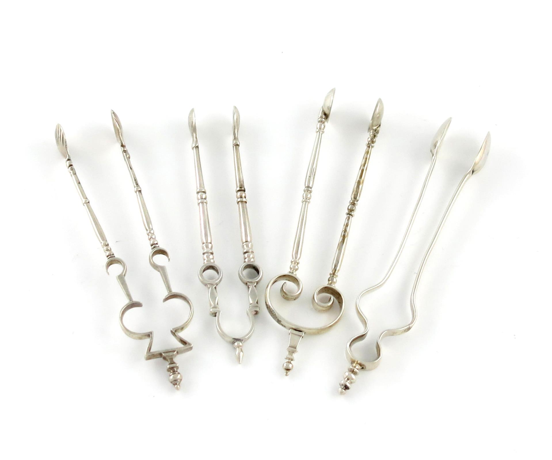 A small collection of four pairs of early 18th century silver 'Andiron' sugar tongs,