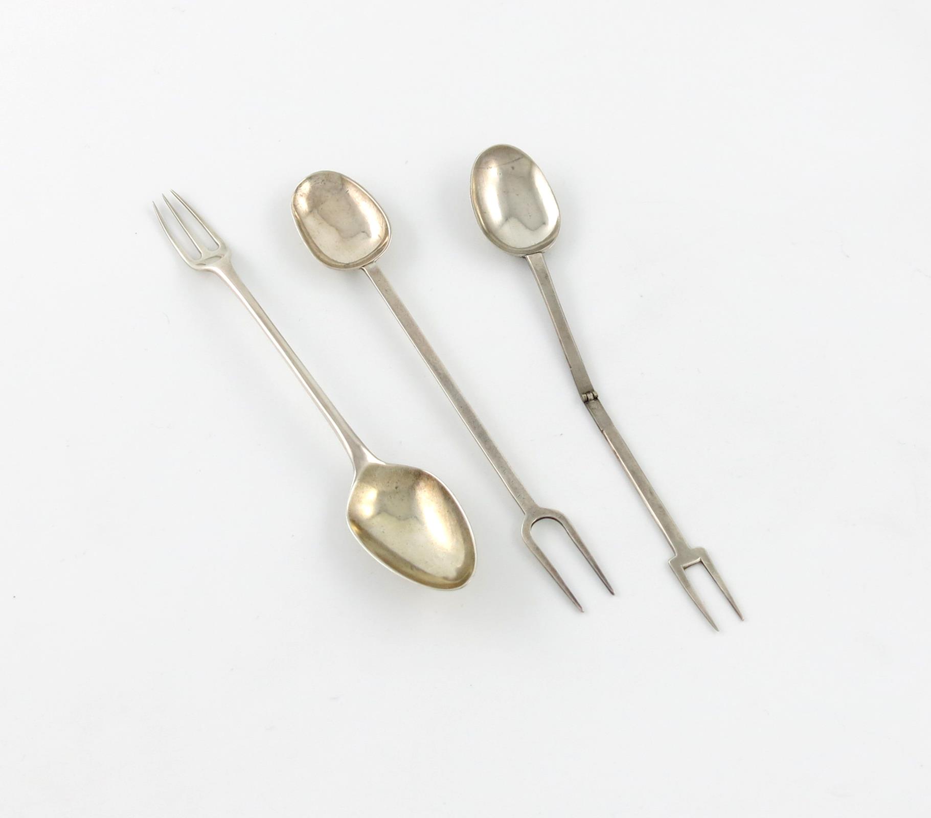 the reverse of the stem initialled 'A.R', length 15.3cm, plus another sucket fork, with a later hinge, plus a George III combination fork and spoon, approx. weight 1.5oz. (3)