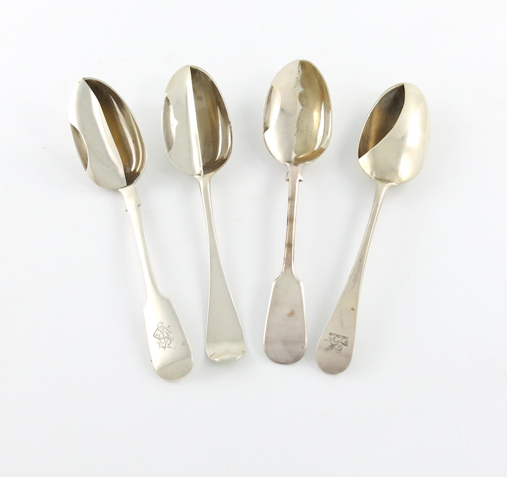 the terminal initialled, plus an electroplated moustache spoon, and two 18th century spoons with moustache/feeding covers, approx. weighable 6oz. (4)
