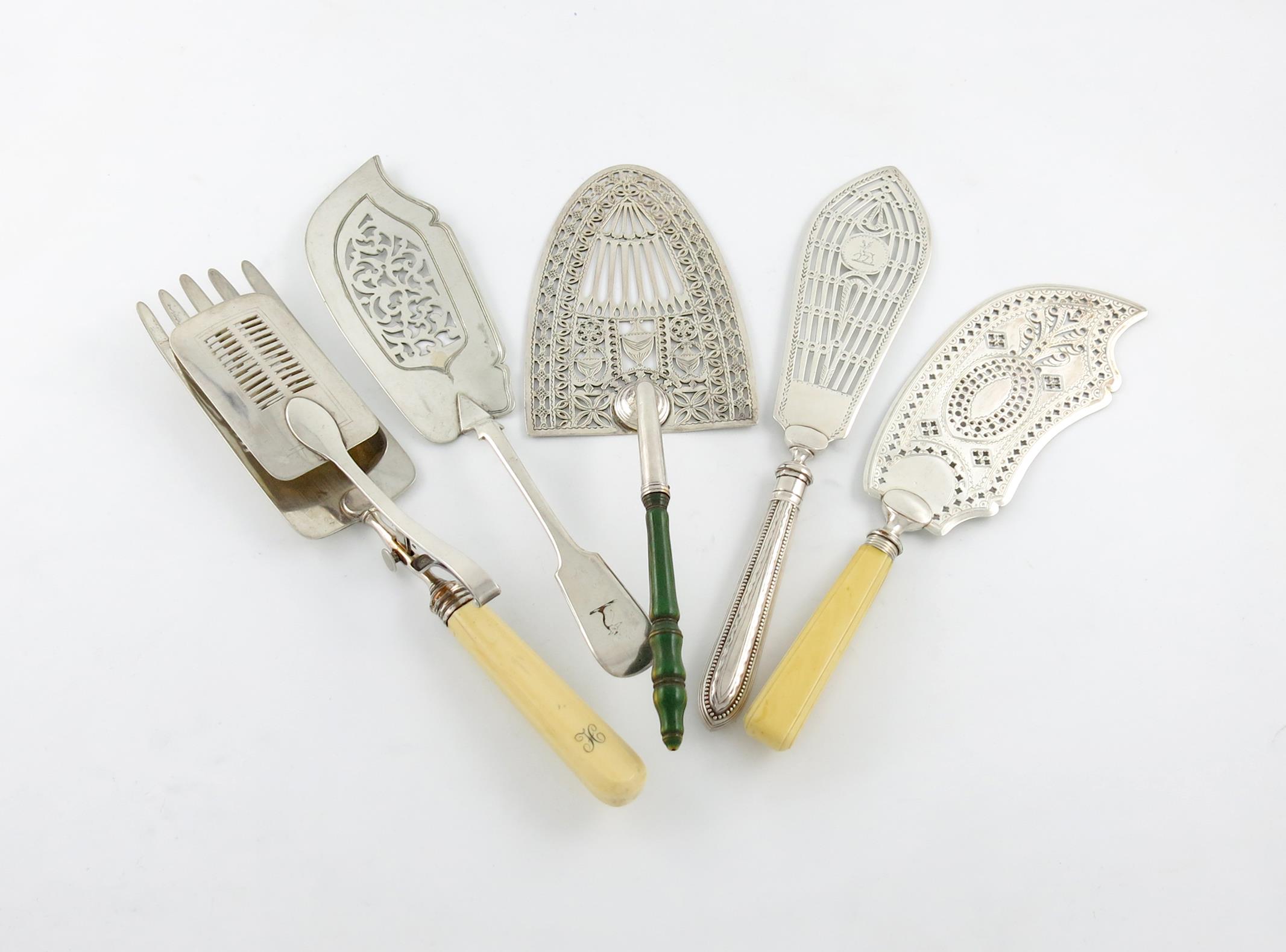 λA small collection of five old Sheffield plated and electroplated fish slices,