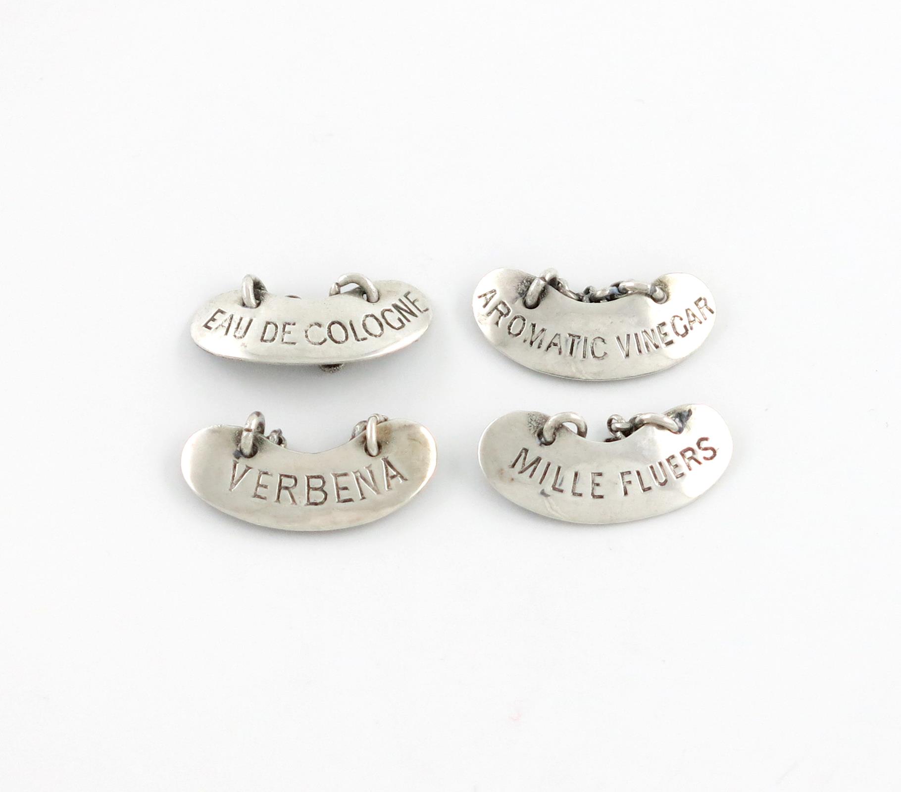 kidney form, incised 'EAU DE COLOGNE', 'VERBENA, 'MILLE FLUERS' and 'AROMATIC VINEGAR', approx. weight 0.4oz. (4)