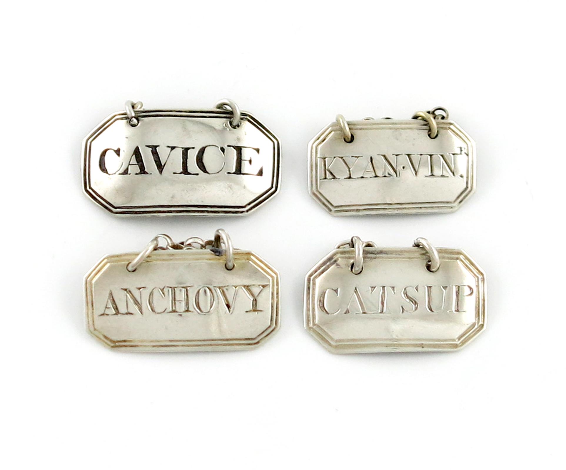 comprising: one titled 'CAVICE', London 1807, plus one 'ANCHOVY', one 'CATSUP', and 'KYAN. VIN', approx. weight 0.4oz. (4)