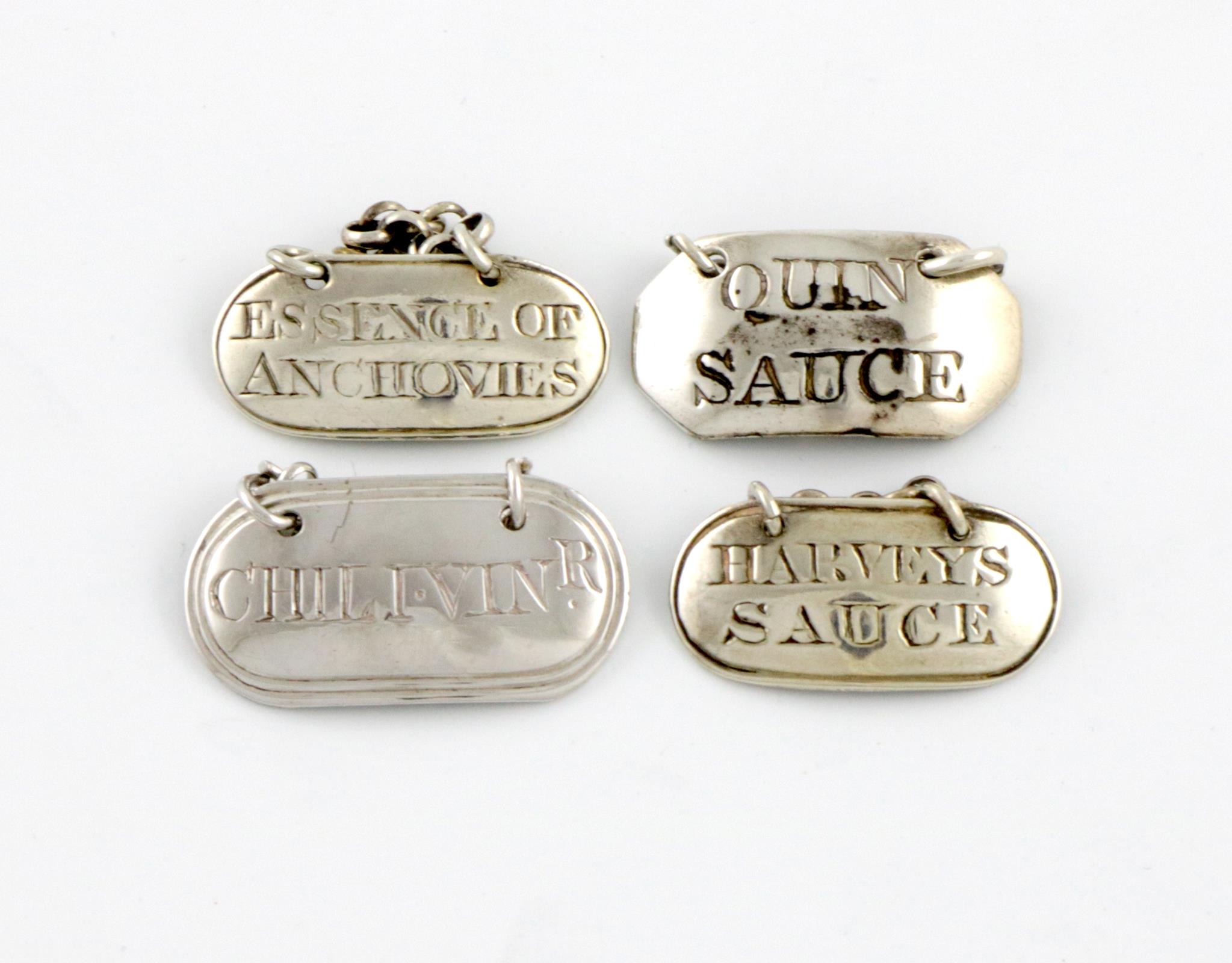 A collection of four antique silver sauce labels