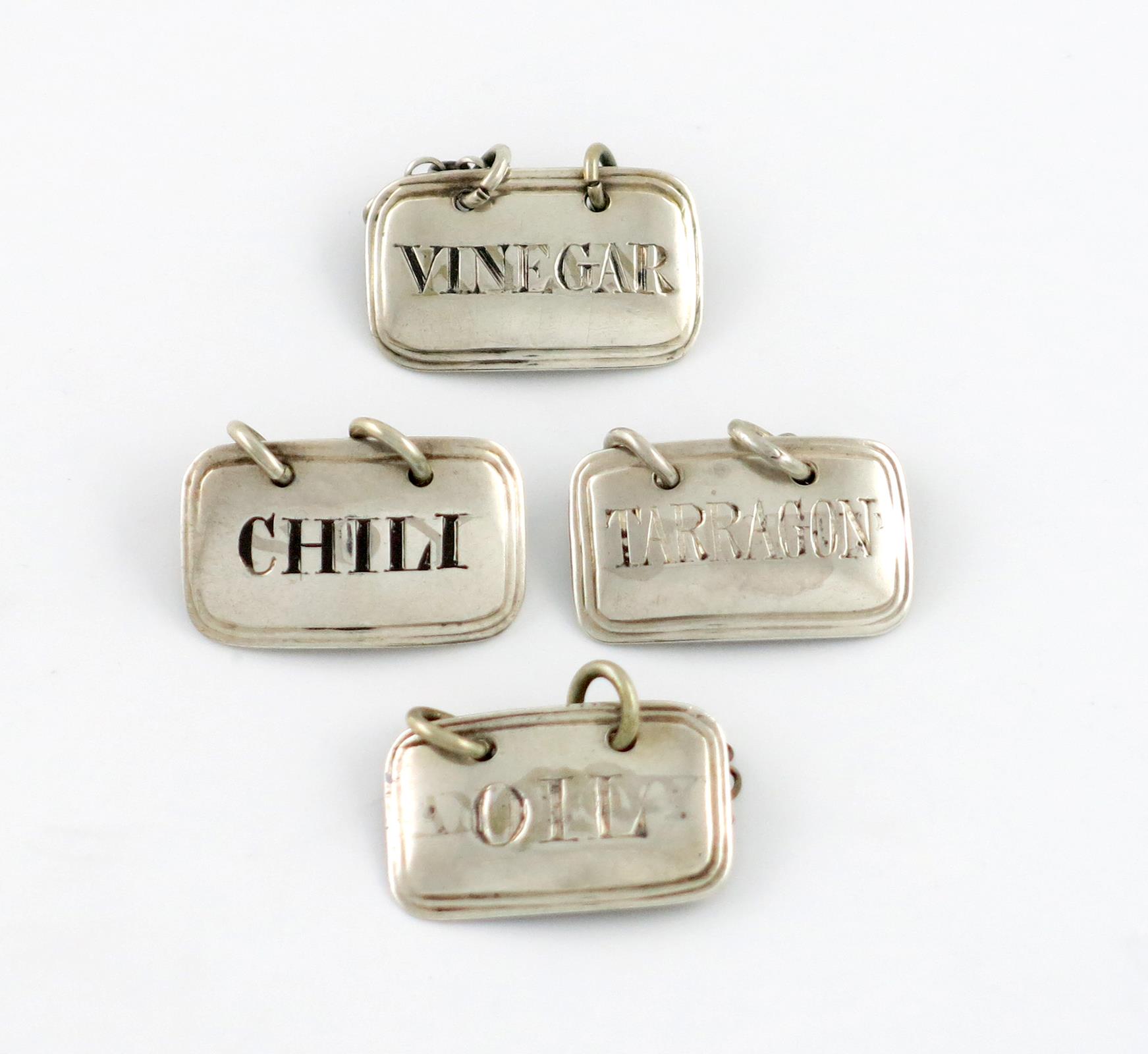 comprising: one by Robinson and Phipps, incised 'OIL', one 'VINEGAR', and two re-titled 'CHILI' and 'TARRAGON', approx. weight 0.3oz. (4)