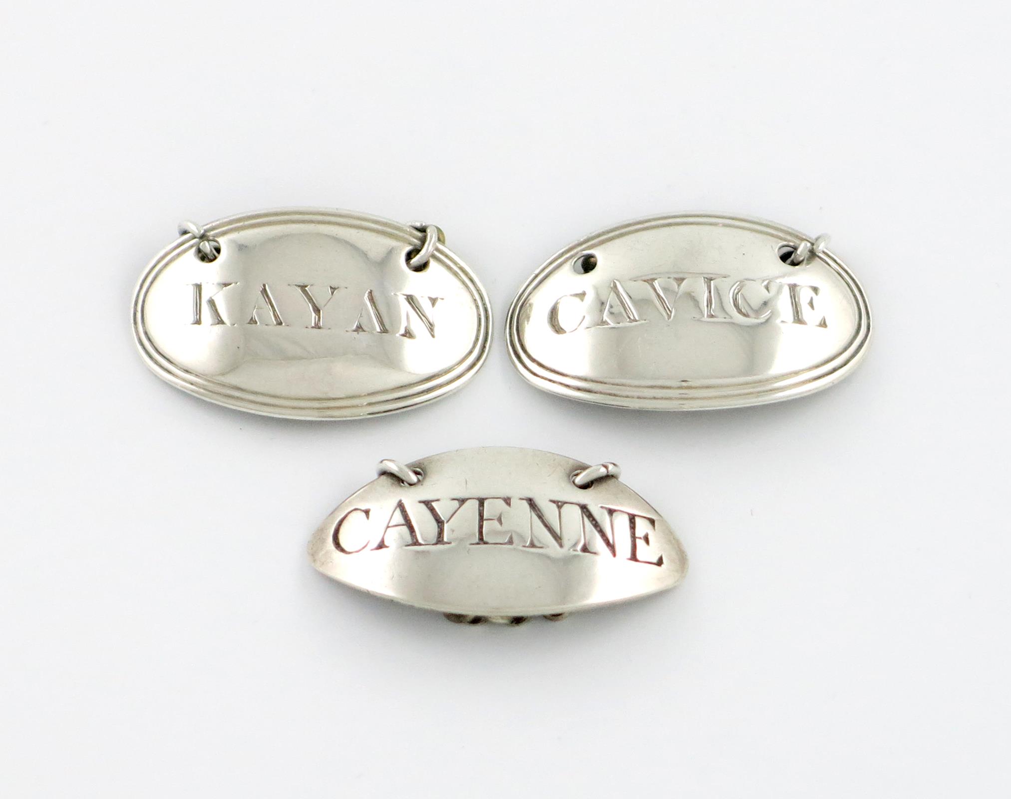 oval form, reeded border, incised 'CAVICE' and 'KAYAN', plus another label, London 1792, incised 'CAYENNE', approx. weight 0.3oz. (3)