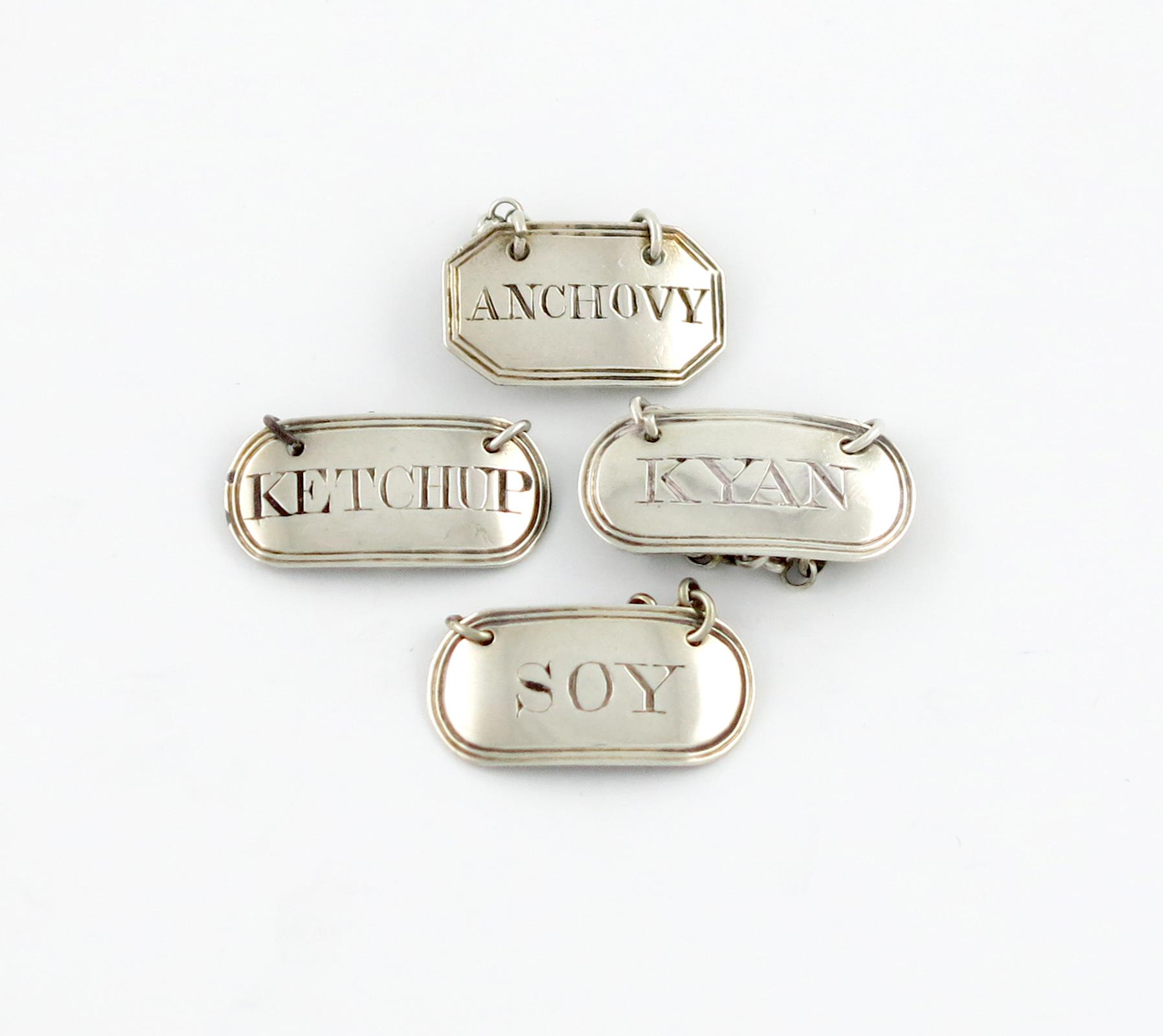 comprising: one incised 'KYAN', one 'KETCHUP', one 'ANCHOVY' and one 'SOY', approx. weight 0.5oz. (4)
