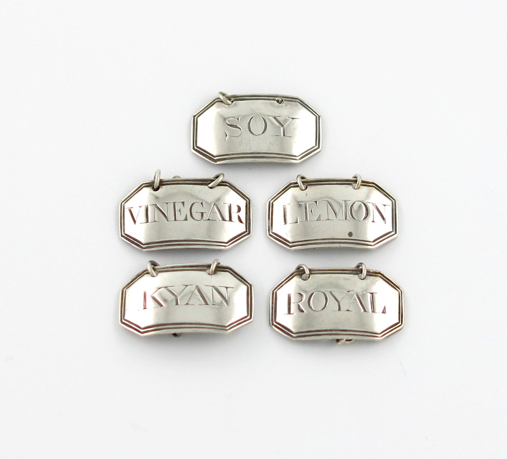 rectangular form, canted corners, reeded borders, incised 'ROYAL', 'VINEGAR', 'LEMON', 'KYAN', and 'SOY,' approx. weight 0.5oz. (5)