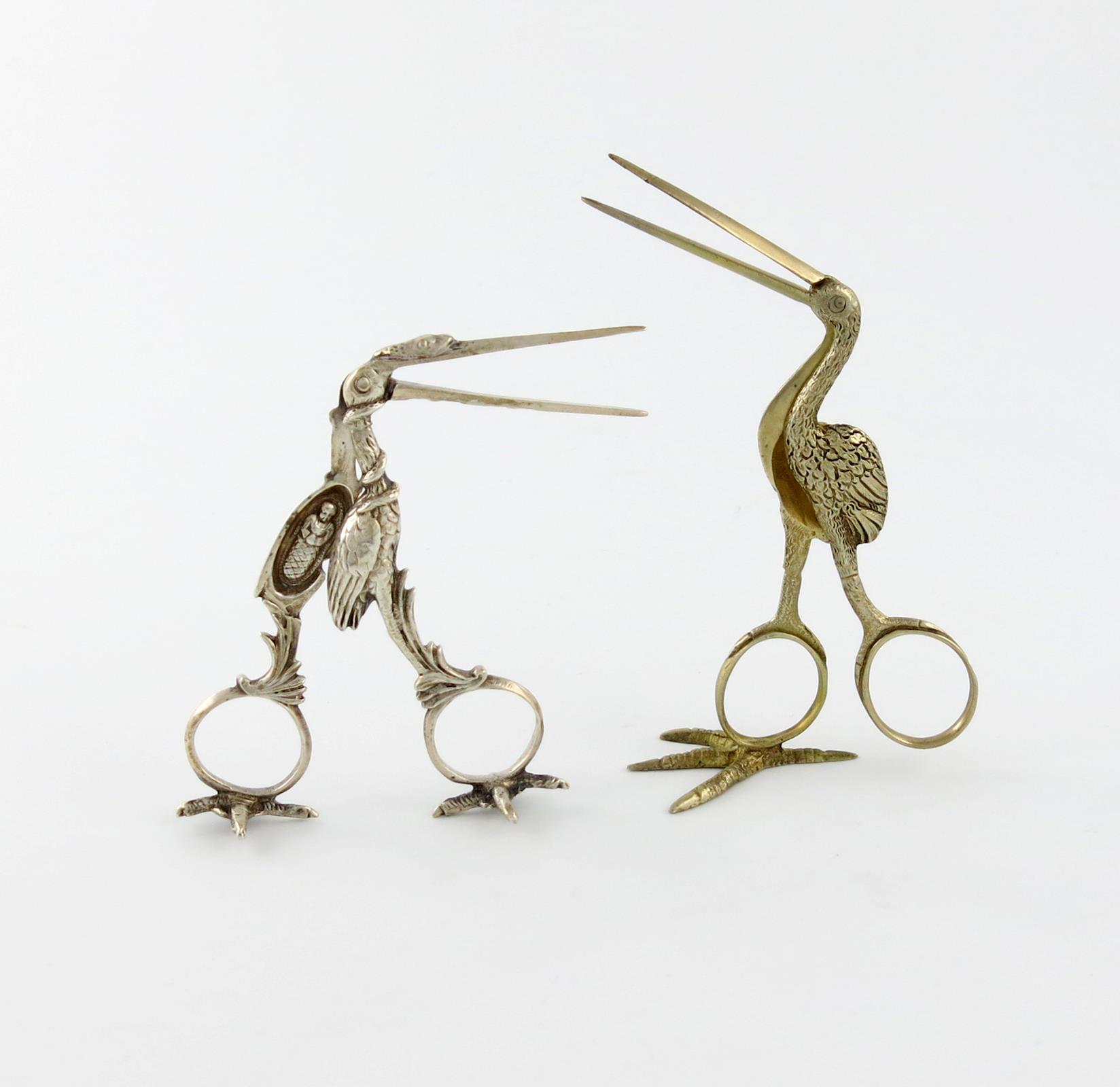 modelled as a stork, ring handles, on a single claw foot, plus a continental silver ribbon threader of similar design, with two claw feet, approx. weight 2.6oz. (2)