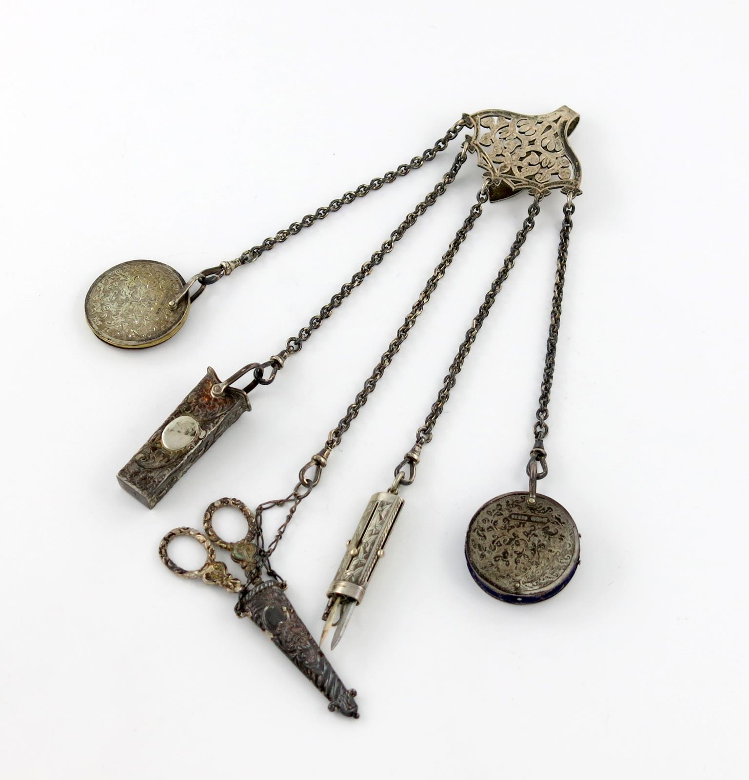 the clip with pierced and engraved decoration, with five chains, with various implements, various dates including pin wheel, an aide memoire, a pair of scissors and case, a slide-action penknife/toothpick/button hook and pencil, and a rectangular case, approx. weight 5oz.