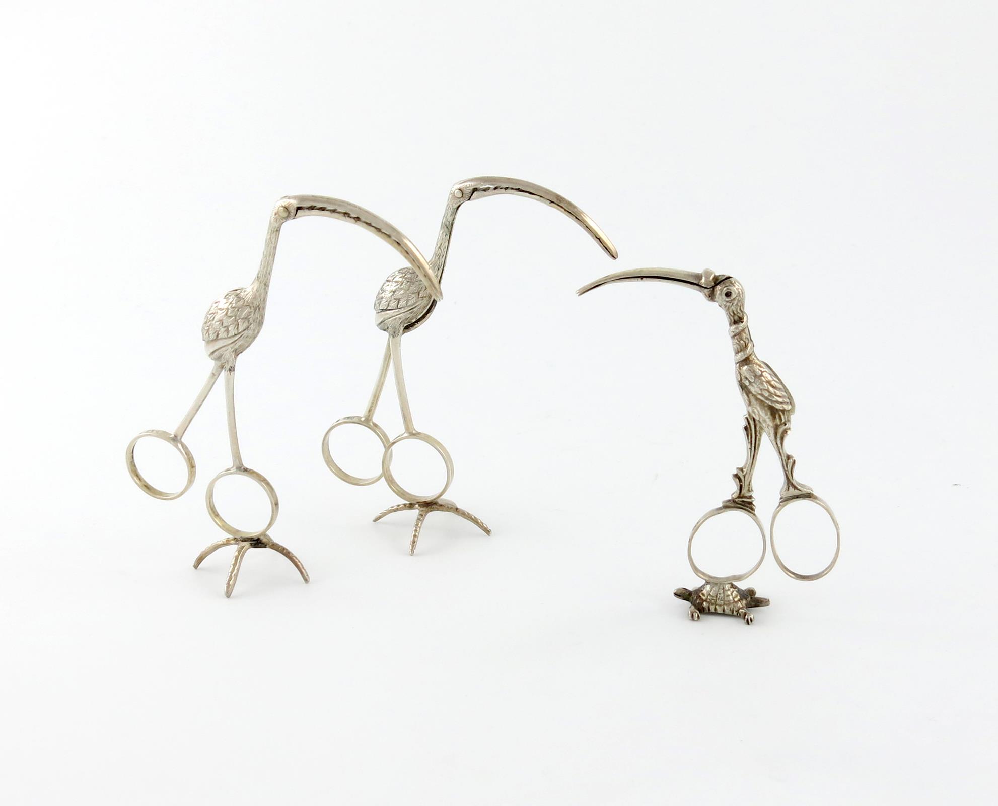 modelled as storks, ring handles, on a single claw foot, plus a continental silver ribbon threader of similar design, on a tortoise foot, approx. weight 3.2oz. (3)