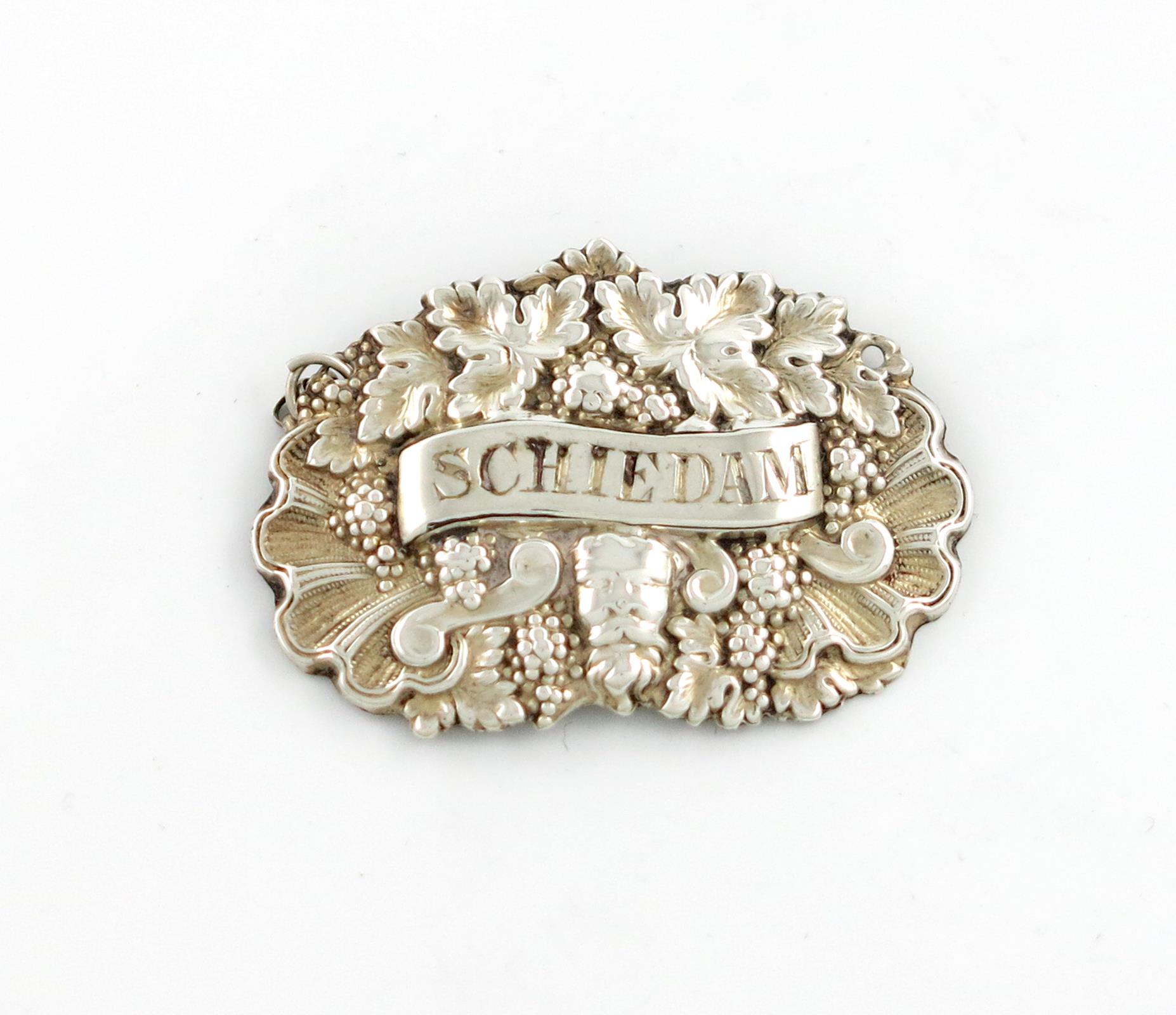 shaped oblong form, with shell and grapevine decoration, incised 'SCHIEDAM', length 4.6cm, approx. weight 0.2oz.