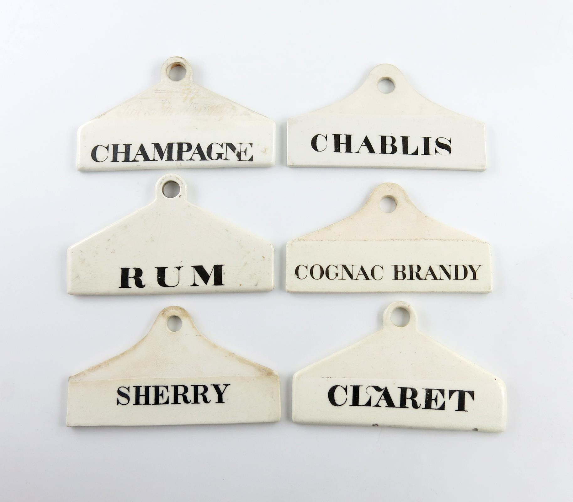 arched rectangular form, titled in black 'COGNAC', 'BRANDY', 'SHERRY', 'CLARET', 'CHAMPAGNE', 'CHABLIS' and 'RUM'. (6)
