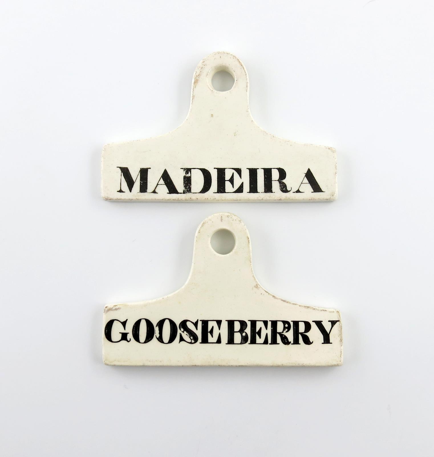 rectangular form, tapering arched tops, titled in black 'GOOSEBERRY' and 'MADEIRA', length 12cm. (2)