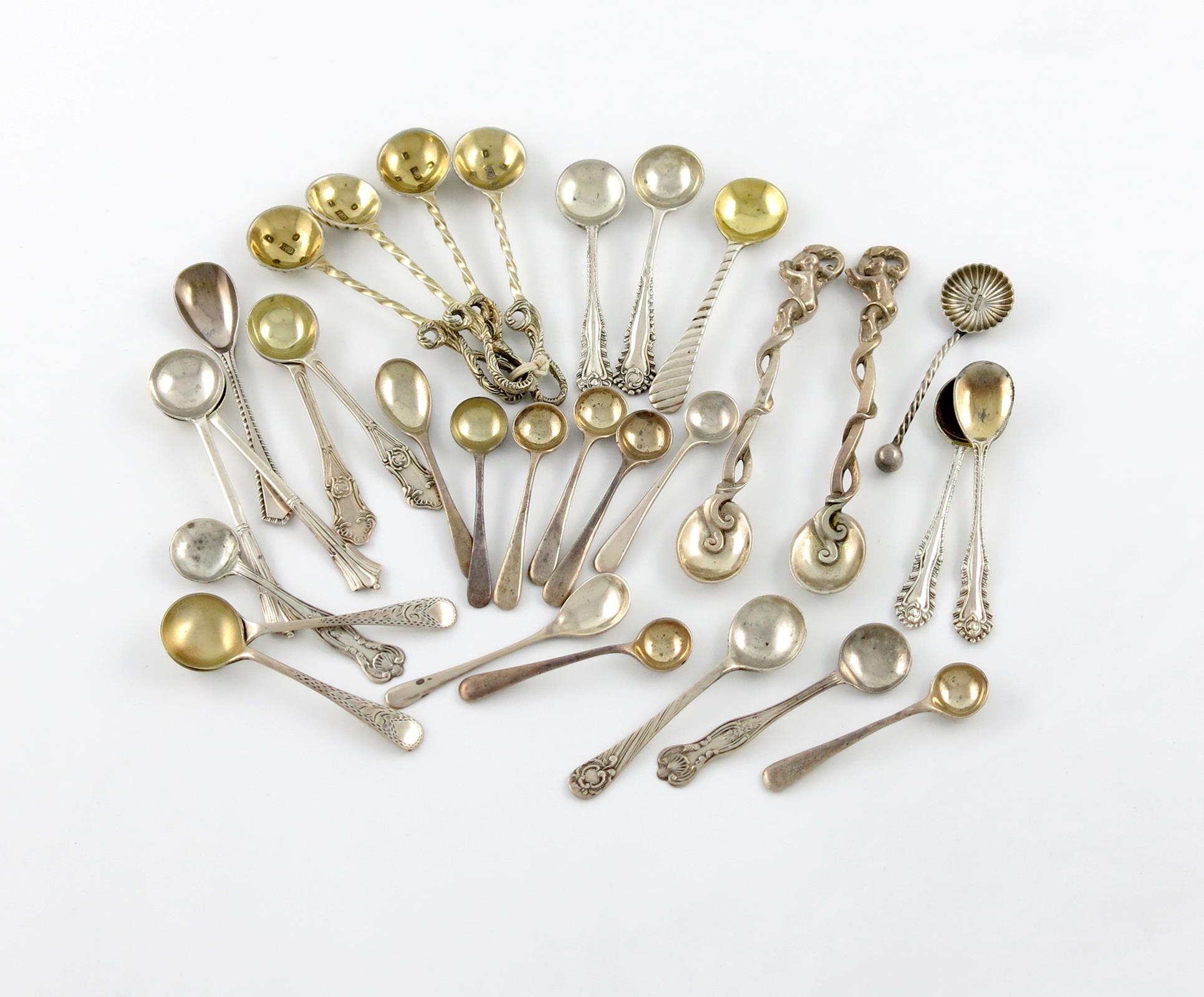 including: a set of four Victorian silver gilt salt spoons, the twist stems with looped whip terminals, shell bowls, by William Dudley, Birmingham 1849, a Scottish figural pair, and twenty-five others, approx. weight 6oz. (qty)