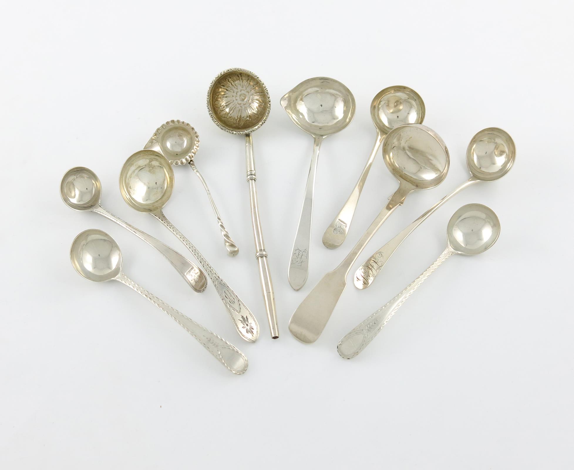 comprising: a pair of bright-cut cream ladles, by Eley and Fearn, London 1900, a Scottish toddy ladle, two Irish examples, and five others, approx. weight 7oz. (10)