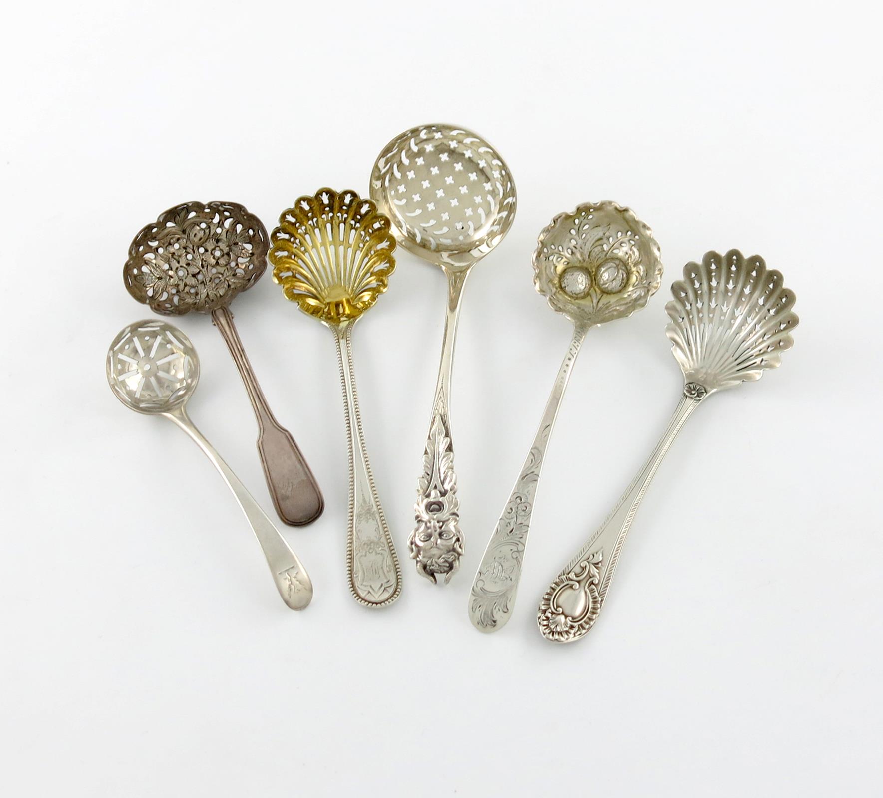 A small collection of six antique silver sugar sifting spoons,