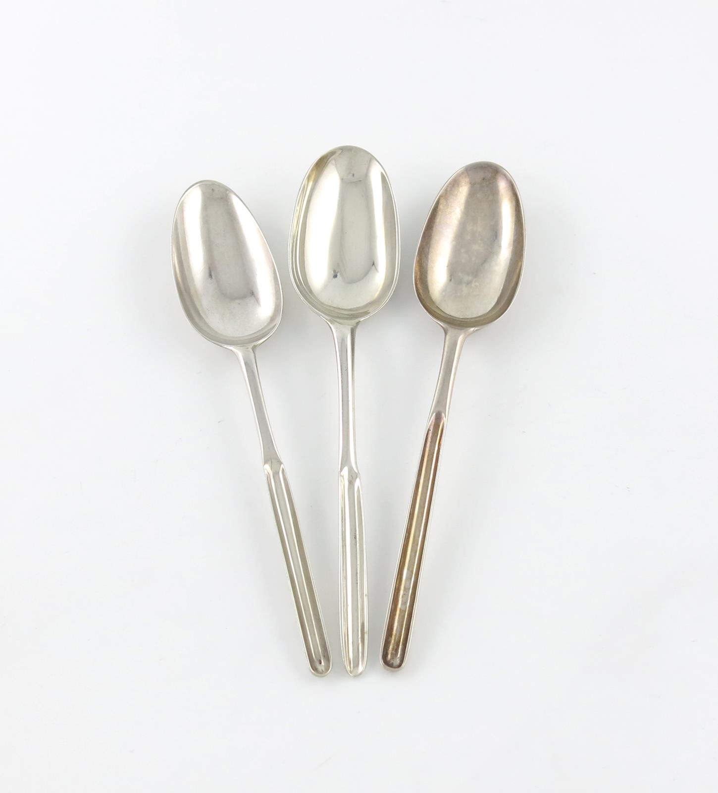 comprising a Scottish one, by Robert Gray, Glasgow, circa 1780, plus one London 1747, and one London 1759, the reverse of the bowl with scroll decoration, approx. weight 5oz. (3)
