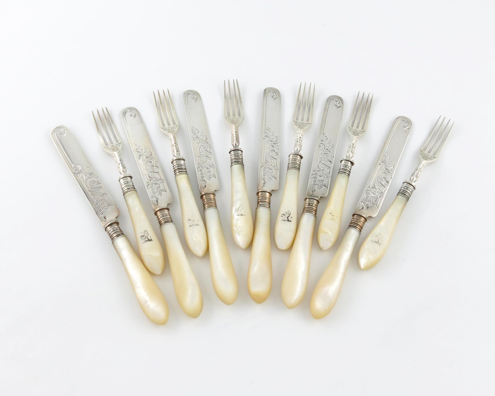 the blades with foliate decoration, the mother-of-pearl handles with a crest. (12)
