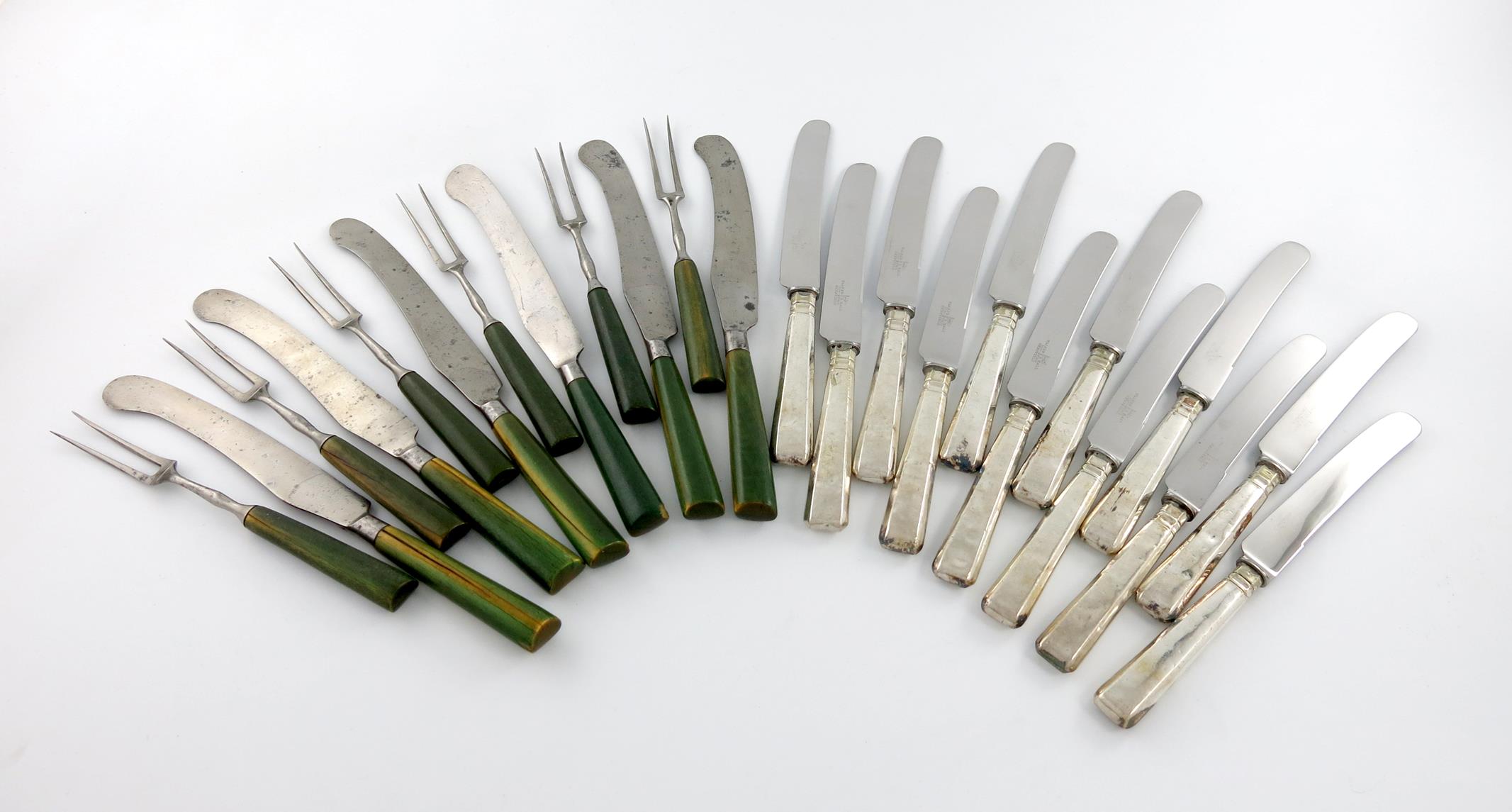 tapering handles, plus a set of six stained green ivory handled table forks and table knives, tapering handles, steel blades and tines. (18)
