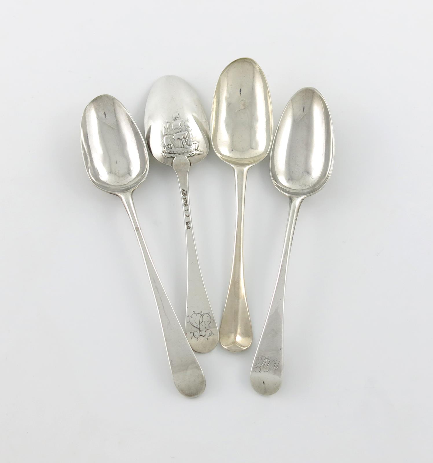 the reverse of the bowl with a galleon in sail, the reverse of the terminal initialled, plus three tablespoons, approx. weight 8oz. (4)