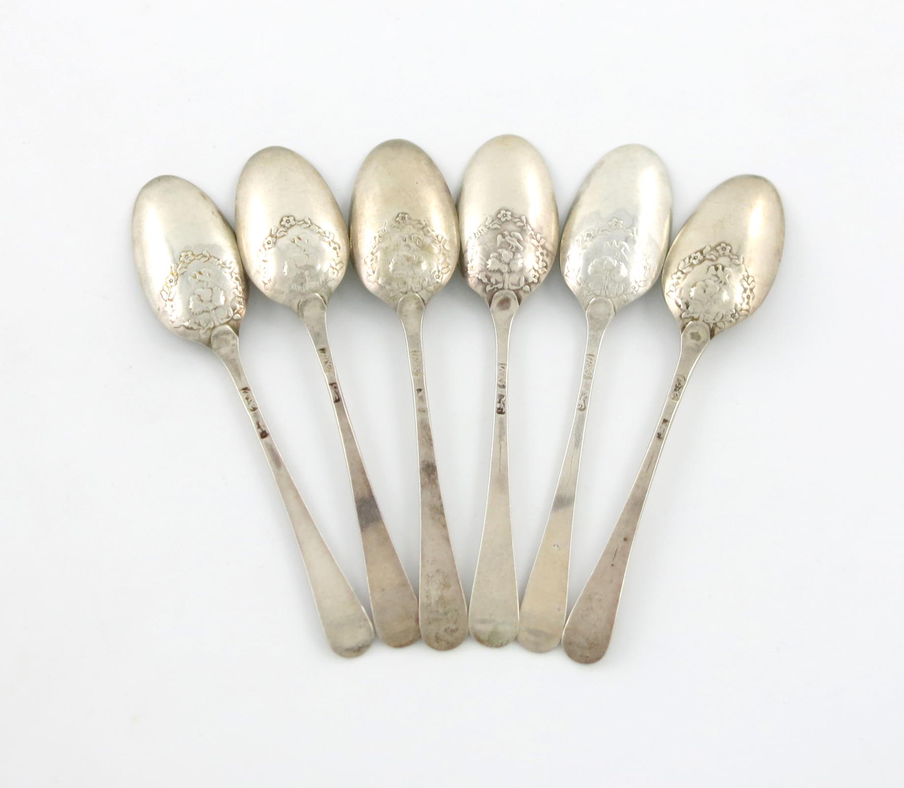 A set of six 18th century silver 'Picture-back' teaspoons,