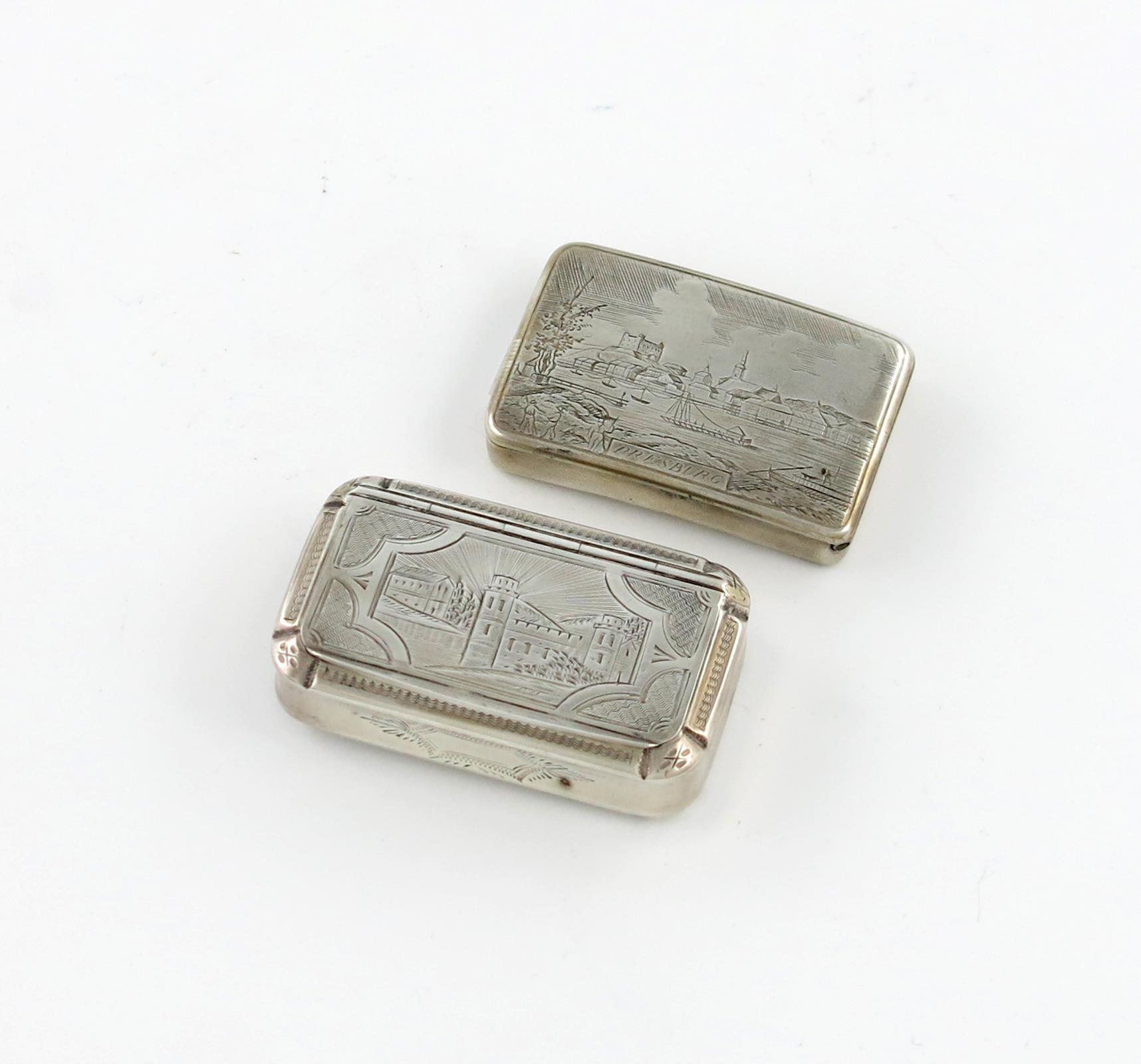 rectangular form, the hinged cover engraved with buildings, engine-turned base, plus an Austro-Hungarian snuff box, the hinged cover with a river and town scene, inscribed 'Presburg', approx. weight 2.2oz. (2)