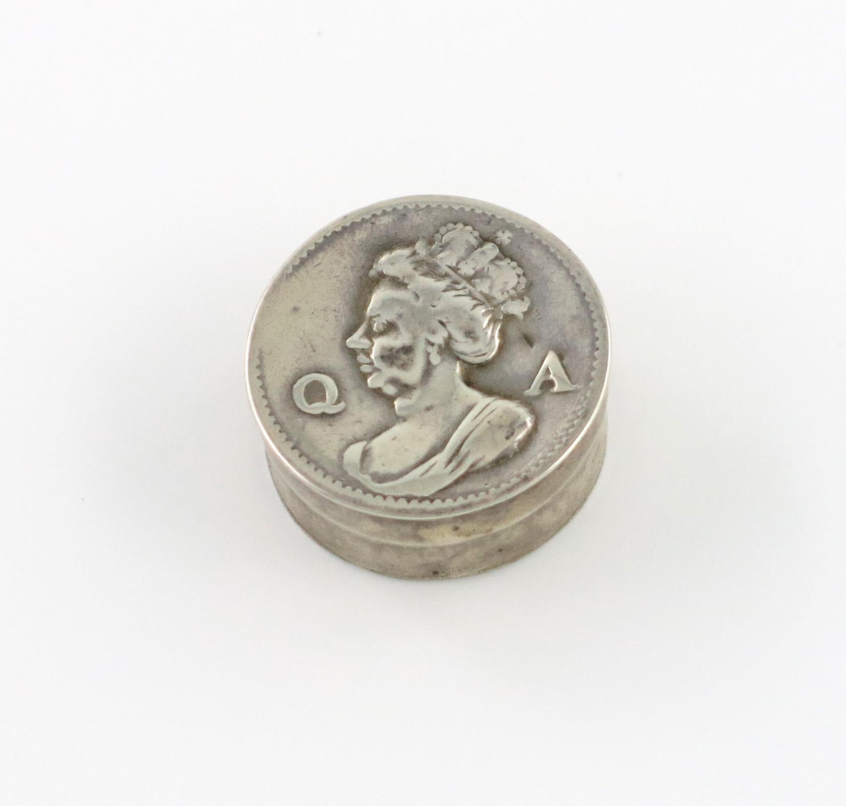 circular form, the pull-off cover with an image of Queen Anne and 'Q' and 'A', diameter 2.2cm, approx. weight 0.1oz.