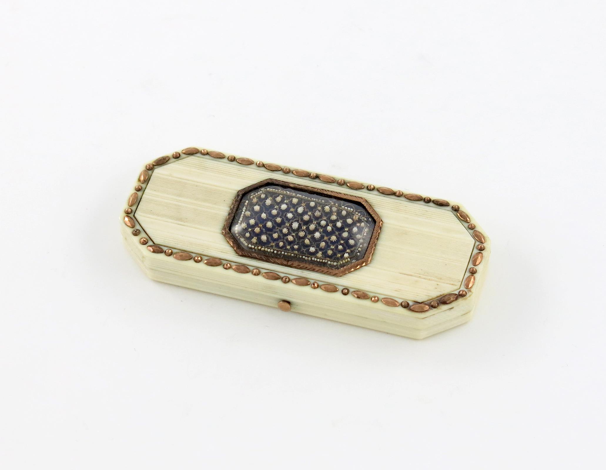 rectangular form, canted corners, the hinged cover with a cartouche with seed pearls on a dark blue ground, the interior with a mirror and velvet lining and plaited hair, length 9cm.