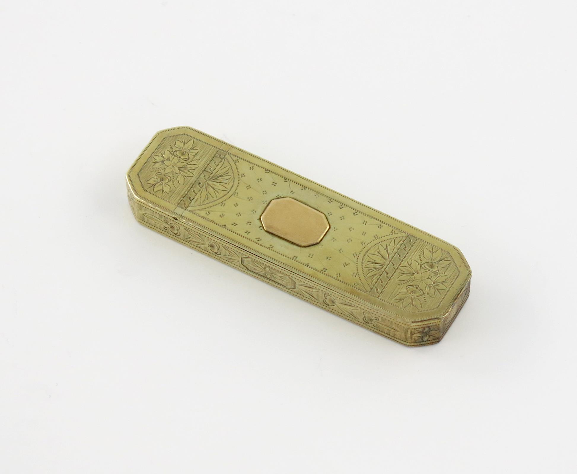 rectangular form, canted corners, engraved decoration, the cover with a vacant cartouche, length 8cm, approx. weight 0.8oz.
