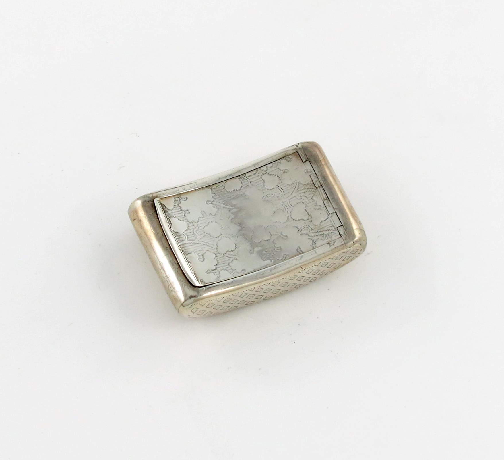 shaped rectangular form, the flush hinged cover and sides and base with engraved decoration, length 7cm, approx. weight 1.8oz.