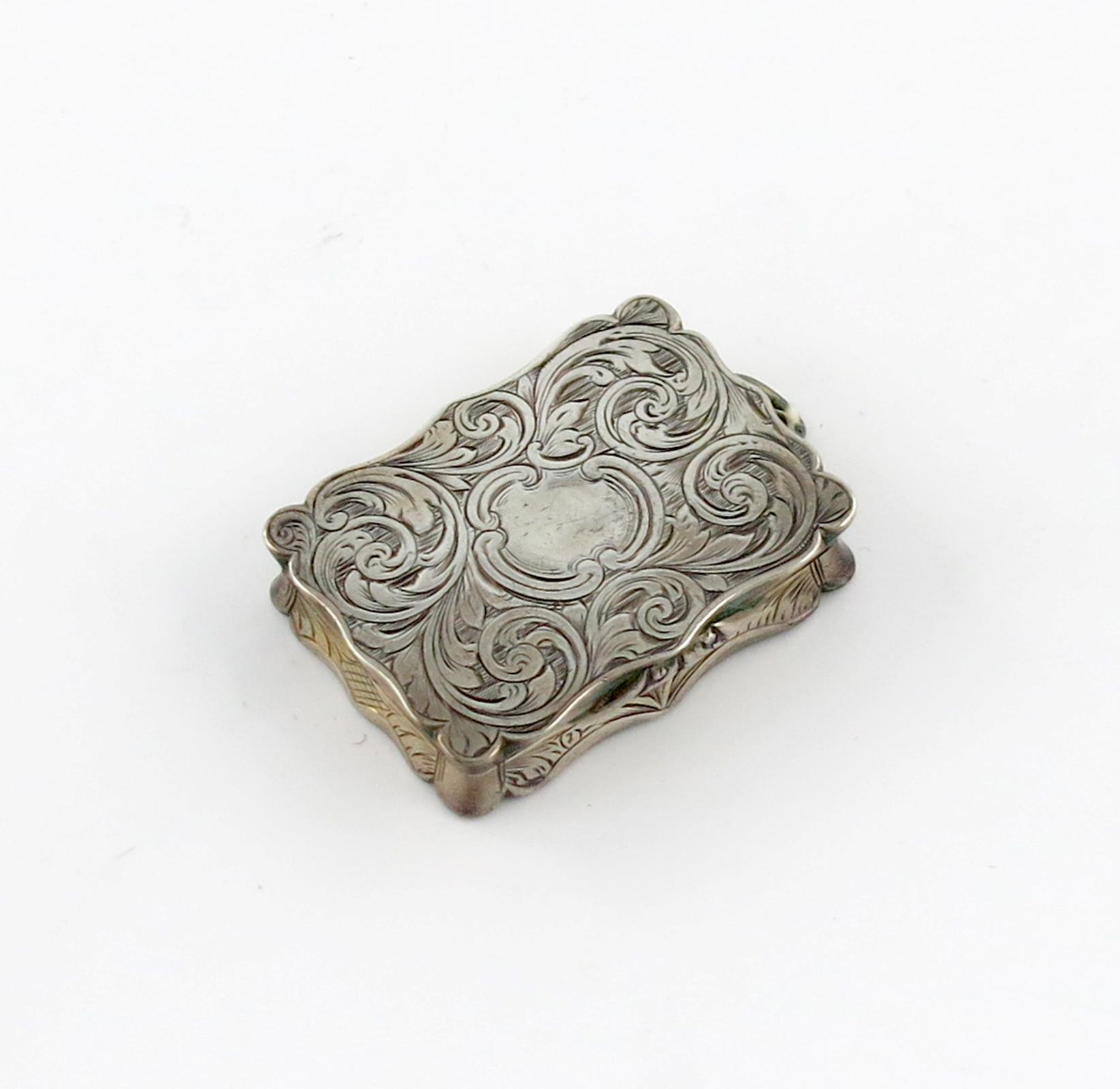 rectangular form, engraved foliate scroll decoration, the hinged cover with a vacant cartouche, the interior with a hinged pierced and engraved foliate scroll grille, with a ring attachment, length 4cm, approx. weight 0.8oz.