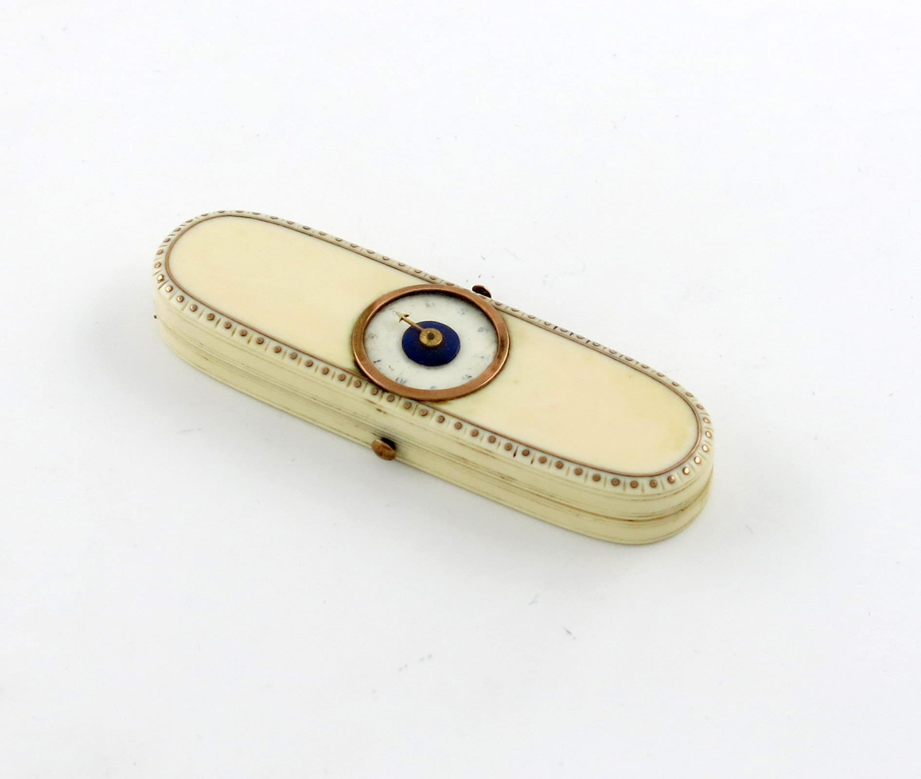 oblong form, the hinged cover with a whisk counter marker under glass, the dial numbered one to ten, with a push-button arrow, gold mounts, the interior with a mirror and velvet lining, length 8.5cm.