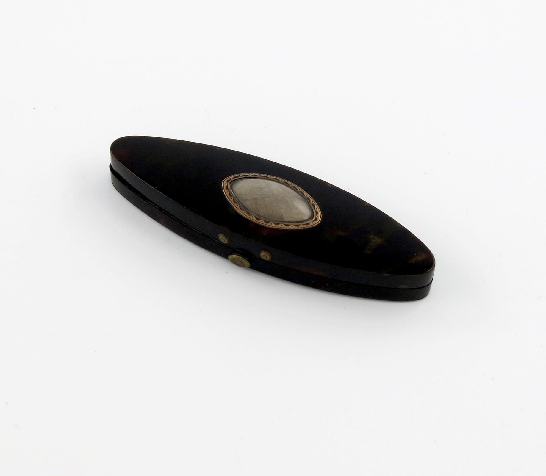 oval navette form, the hinged cover with an oval cartouche of plaited hair under glass, the interior with a mirror and velvet lining, length 9cm.