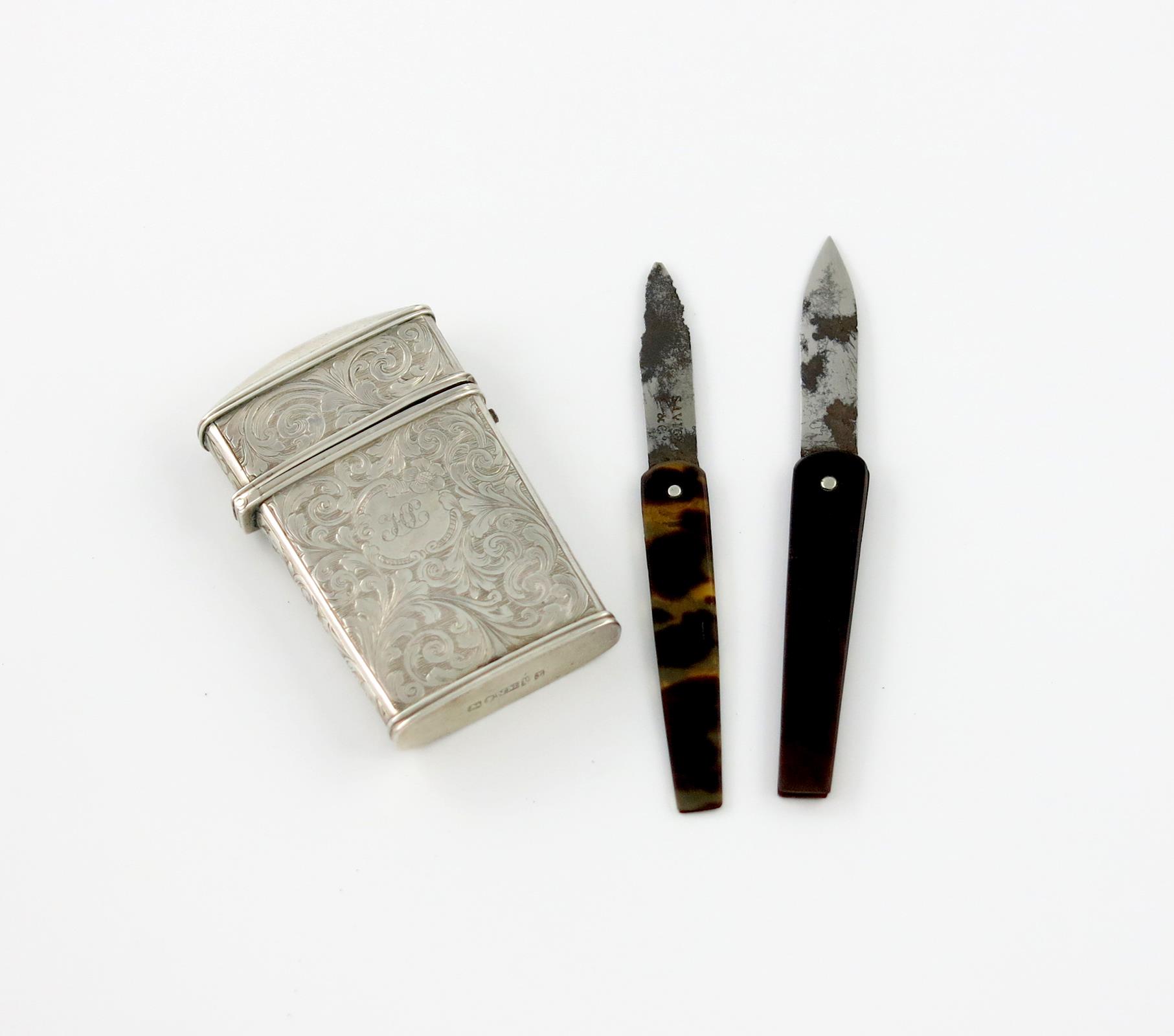 tapering rectangular form, engraved decoration, the interior with two tortoiseshell lancets, length 6.3cm, approx. weight 0.9oz.
